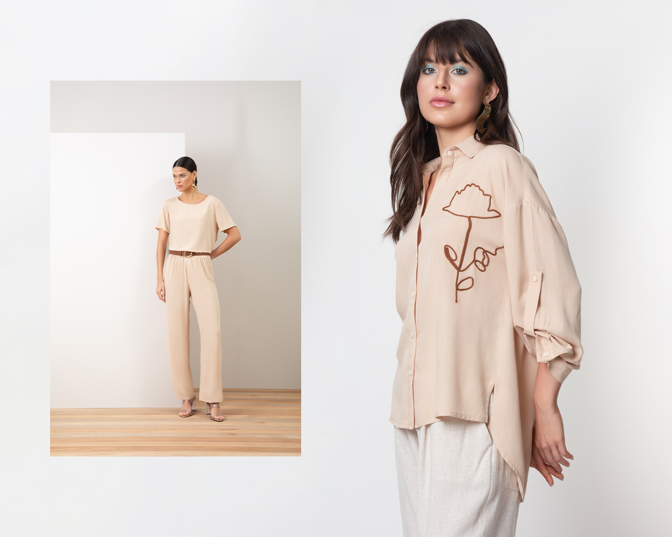 Para transmitir elegância e modernidade, combinações em tons beges para um office day são perfeitas. Desde uma camisa bordada que possui mais detalhes, até um conjunto monocromático clássico.