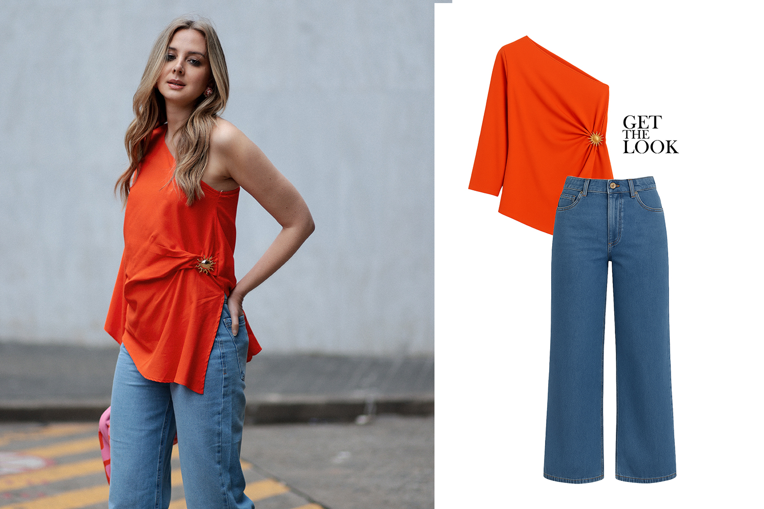 O primeiro look traz um top assimétrico em laranja intenso. A peça tem caimento leve e destaca o visual. Além disso, o jeans de modelagem solta cria equilíbrio. Por isso, a composição resulta em um look moderno, fresco e descomplicado.