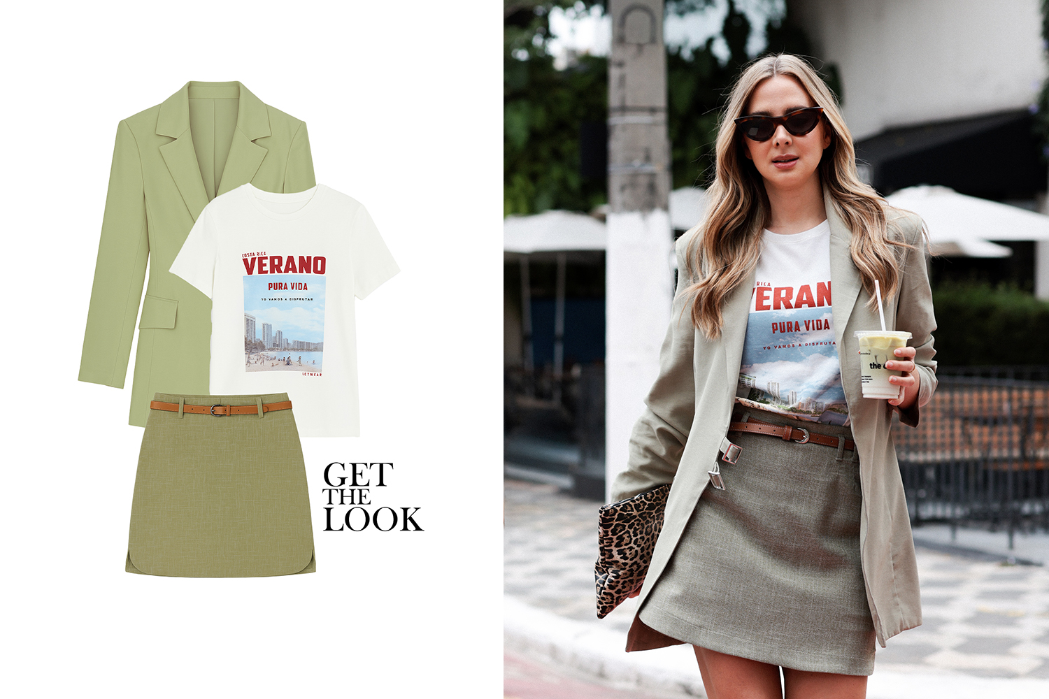 O segundo look aposta na alfaiataria leve. O blazer alongado traz uma linha elegante. Em seguida, a minissaia estruturada adiciona feminilidade ao visual. Além disso, a camiseta estampada oferece um toque urbano. Dessa forma, o look combina clássico e casual com harmonia.