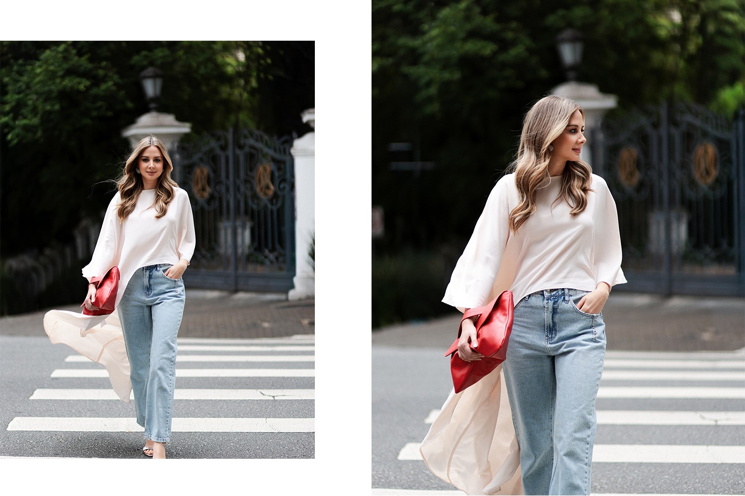 A terceira proposta apresenta uma blusa fluida com movimento natural. O jeans claro reforça essa suavidade. Além disso, a bolsa vermelha cria um ponto de cor sofisticado. Por isso, o look funciona bem ao longo do dia e também à noite.