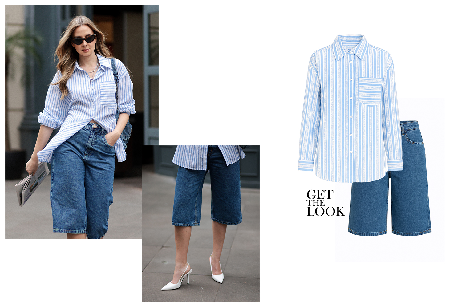 No quarto look, a camisa listrada ampla aparece como destaque. As listras são elegantes e atemporais. Além disso, a bermuda jeans midi traz modernidade. Assim, a composição se torna prática, fresca e cheia de estilo.