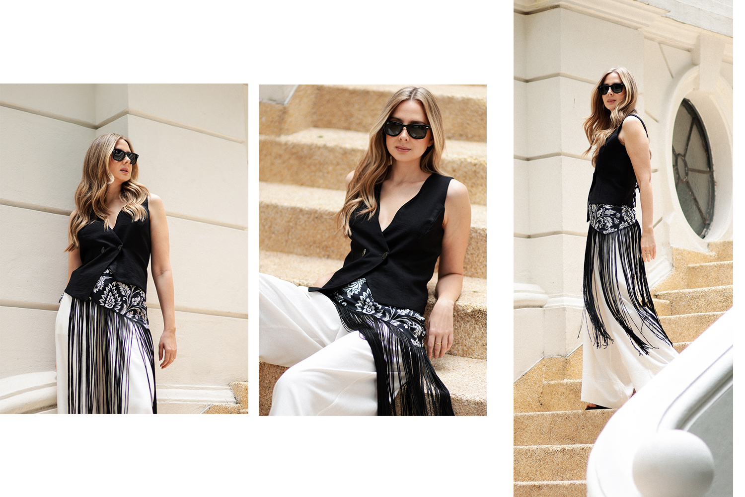O quinto look explora o contraste entre preto e branco. O colete preto alonga a silhueta. Em seguida, a peça com franjas adiciona movimento ao visual. Além disso, a calça clara finaliza tudo com leveza. Dessa forma, o look fica marcante, simples e equilibrado.